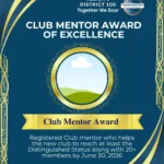 Registered Club mentor who helps the new club to reach at least the Distinguished Status along with 20+ members by June 30, 2026.