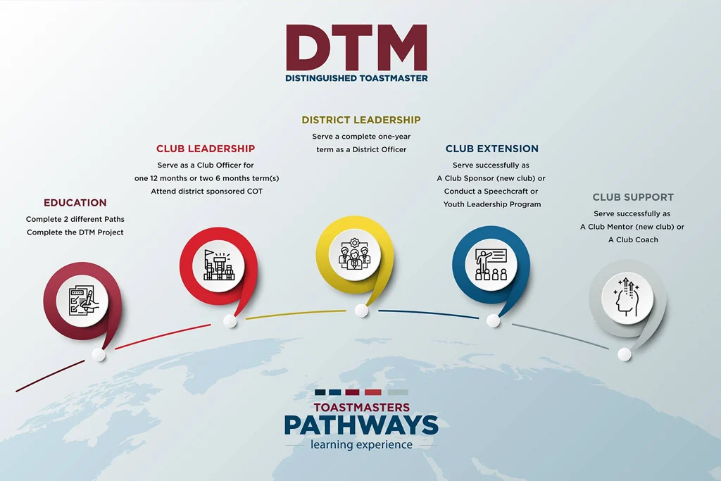 The Distinguished Toastmaster (DTM) award represents the highest level of educational achievement in Toastmasters.