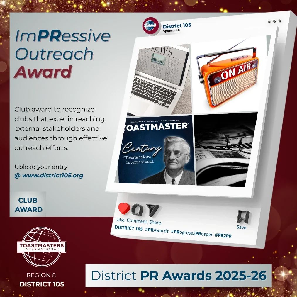 District 105 PR Team takes the branding and compliance to the core of each Public relation activity across the district from posters to the events. As the Branding & Compliance team is in charge of ensuring the Toastmasters brand is used accurately in the clubs, areas, and divisions across the district. We also focus on educating the PR managers on branding by providing training, snippets, and Q&A sessions. We encourage the clubs to focus on the below points on their entire PR activities.
